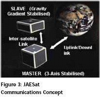 The JAESat mission outlined in Enderle (2002, 2004) will ultimately consist of two micro-satellites (see Figure 1) which will fly in a formation. The JAESat micro-satellite itself will have two components, a master satellite and a so-called slave satellite. The components of JAESat will be attached to each other during the launch phase and will be separated in space, after the release of JAESat from the launcher. The JAESat mission is designed to conduct a variety of experiments based on the mode of interoperation between the payloads on-board the two satellites. A communication link between the two satellites will be established in the form of a RF Inter-Satellite Link (ISL). It is anticipated that JAESat will be launched in 2006. Negotiations with a launch provider for a piggy back launch are ongoing. For this reason the final orbit is not definite yet. However, it is intended to have a circular, nearly polar orbit with an orbit altitude of about 800 km. The operational life time of JAESat is expected to be round 12 months. After the separation of the slave from the master satellite the two satellites will drift away from each other with a low drift rate.